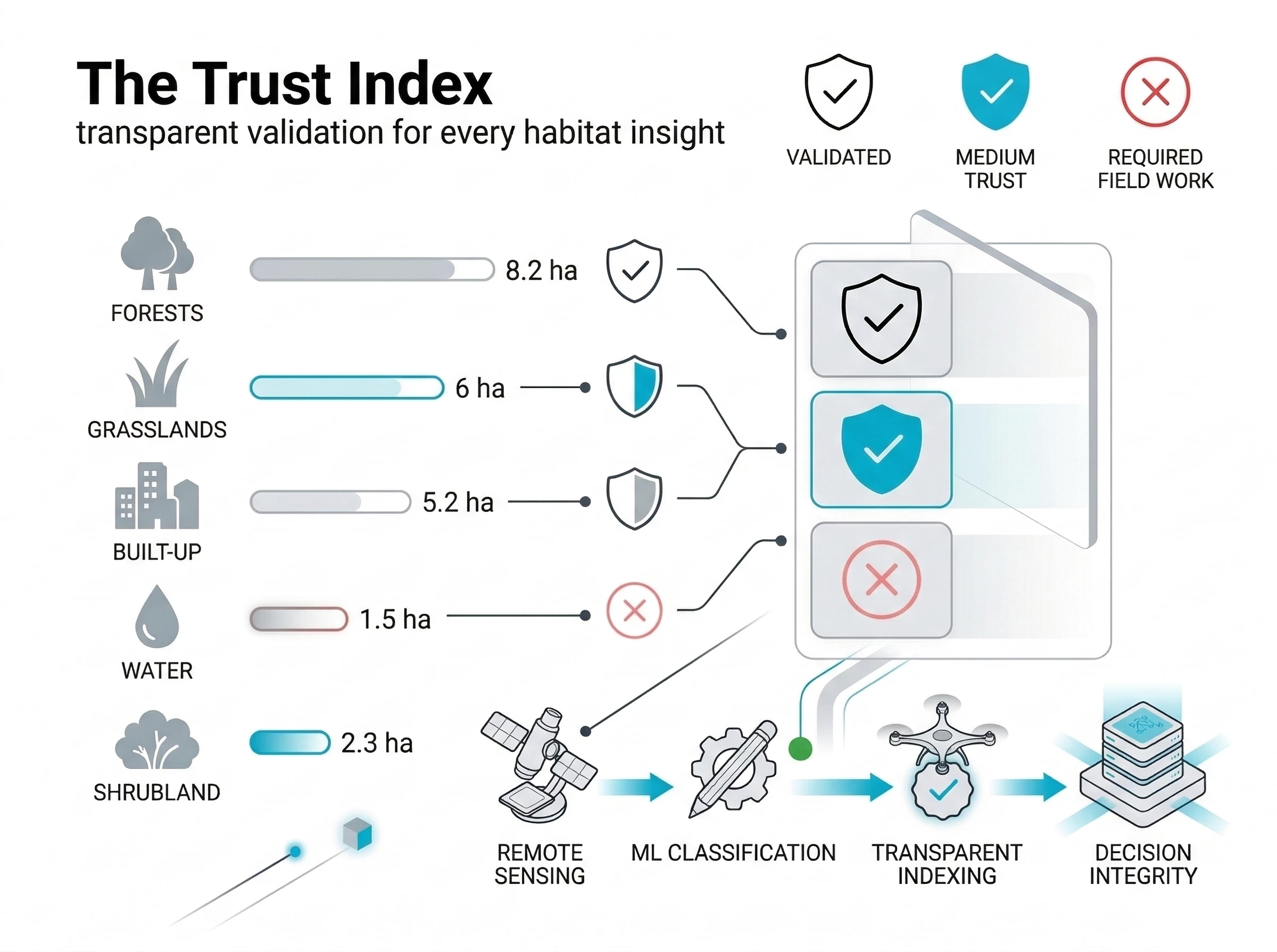 We provide transparent validation for every habitat insight. The Trust Index helps teams understand the confidence levels behind our outputs, ensuring data integrity for critical decision making.